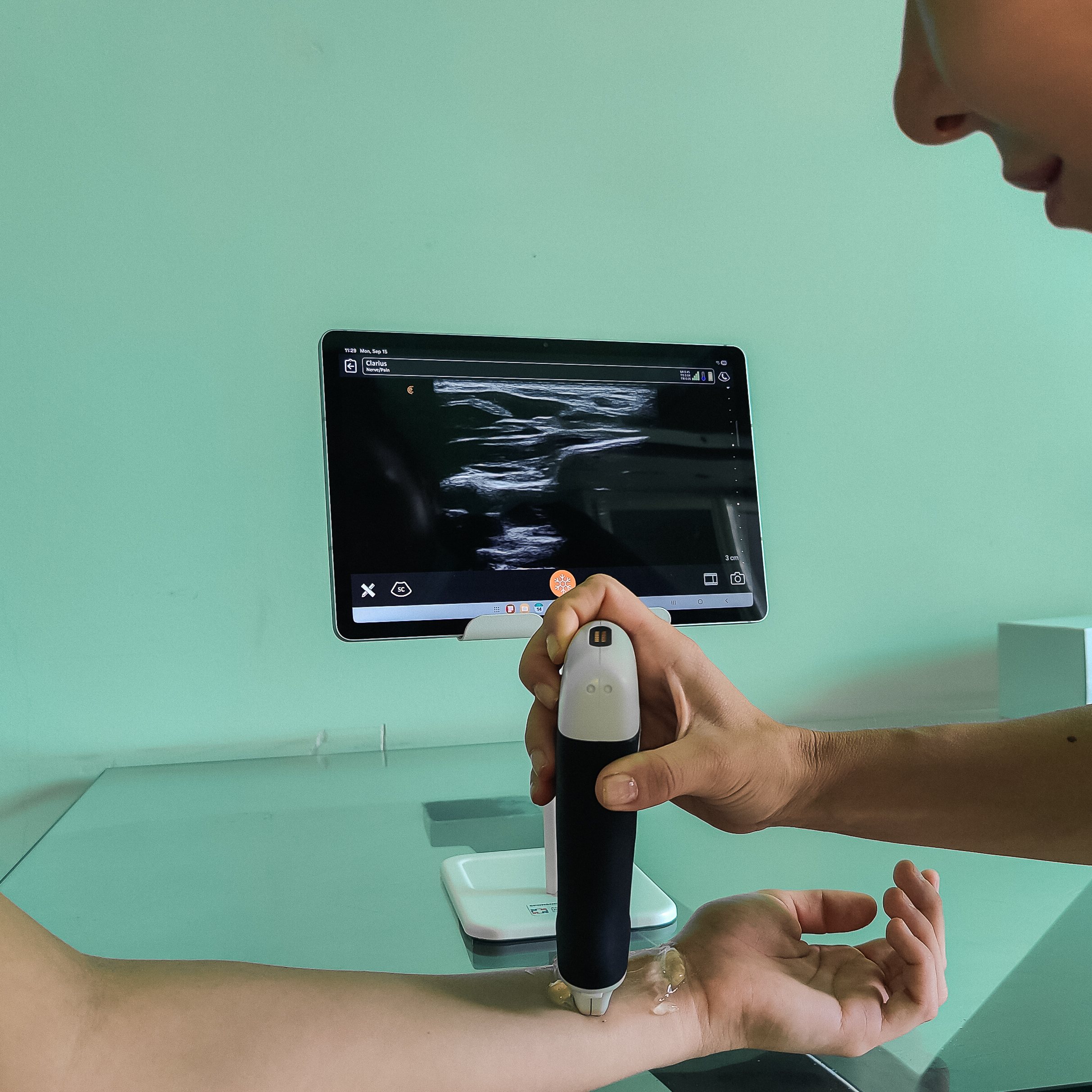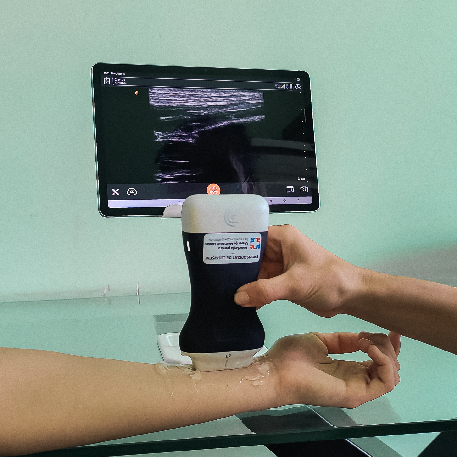 Specialiștii de care vă povesteam deja folosesc Ecograful wireless Doppler color, model Clarius L7 HD3, portabil. Lucrând cu acest dispozitiv, efectuează tehnici moderne de analgezie regională, reducând astfel necesitatea anesteziei generale în intervențiile mici și medii. De asemenea, aparatul este foarte util în diaognosticul și tratamentul ”la pat”, în sala de operație sau în urgențele care pot apărea pe secție.